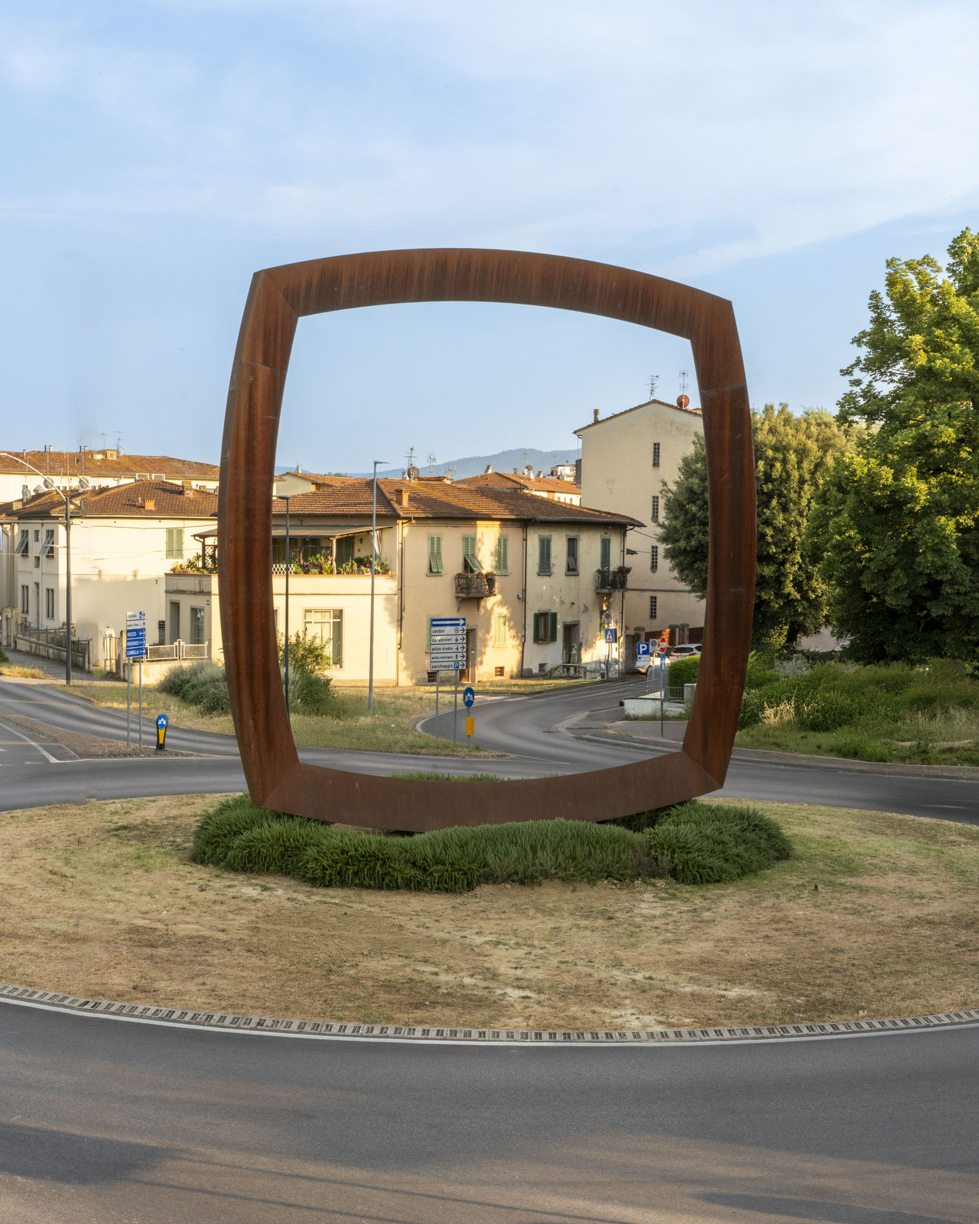 Saturday, June 28th h 6:30 p.m., San Giovanni Valdarno officially welcomes Mauro Staccioli’s Cerchio Imperfetto, 2008, into its townscape. The work is placed in the traffic circle located in front of the Dario Cecchini’s activity, which, choosing to invest in culture, offers to the city an artistic sign of great value; the Cerchio Imperfetto, with its symbolic force and suggestive value, invites citizens and visitors to a renewed gaze on the urban landscape, in the wake of great contemporary art.